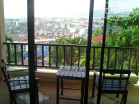 Был приличного размера балкон со столиком и стульями. Оттуда открывался просто ПОТРЯСАЮЩИЙ вид на утопающий в зелени отель, бассейн, весь город и море!!!