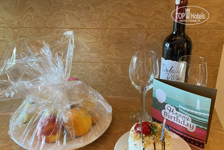 Отель поздравил с днём рождения, открытка, тортик, бутылка вина, фруктовая тарелка, очень приятно!