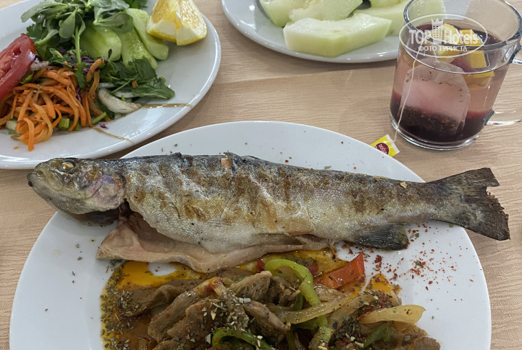 Еда отличная,особенно порадовало,что много готовят на гриле,много разной рыбы-форель великолепная,сибас,дорадо,вкусная индейка,в вок женщина делала очень вкусную говядину с овощами,фрукты-дыни,абрикосы,сливы,яблоки,арбуз.