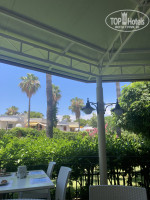 Первая линия,поэтому море сразу же за красивой цветочной изгородью. Лежаки найти можно, даже если прийти не утром. Пирс немного загораживает вид, но зато с него можно нырять.плит нет, мелкая галька.заход в море комфортный.