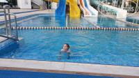 Бассейны. Крытый грели числа до 20 мая, вода была градуса 32-34 – очень теплая! Потом выключили и стало уже не так детям кайфово, но к этому времени прогрелись открытые бассейны, поэтому уже купались в них. Горки прикольные, но не особо быстрые – детям пойдет. Есть детские горки с мелким бассейном, прогревалась вода там хорошо в мае. Бассейн со взрослыми горками подогревают в апреле и ноябре по погодным условиям.