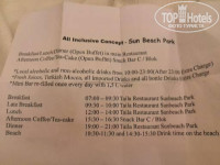 Тут без недостатков. Я допускаю, что разнообразия в некоторых отелях бывает побольше, но нам с головой хватало того что было. Стоит добавить, что у нас обоих это 6-7 поездка в отели формата "всё включено", и тут действительно не остаться голодным и недовольным. Прикрепил расписание приёмов пищи в фото. Очень понравилось, что можно приходить на завтрак/обед/ужин в последний час или за 30 минут до конца, и не наблюдать пустые формы от еды(ничего не заканчивается как это иногда бывает в других отелях). Я бы даже рекомендовал приходить как мы, под конец, так как в первые полчаса-час по расписанию действительно бывают незначительные очереди и иногда затруднительно найти себе столик. Много турецких сладостей(хоть и довольно однотипных: пропитанные в сиропе бисквиты, небольшие тортики, пирожные). На обед и ужин всегда есть мясо разного формата, также бывает рыба. На завтраке и ужине работает гриль-зона у бассейна. Там делают на заказ утром - оладьи/омлеты/глазунью, вечером выбираешь из готового - шашлык/тушёные овощи/запечённая рыба(в разные дни на ужине разные блюда в этой зоне).