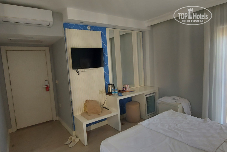 Наше заселение было в полночь. Заселили оперативно, НО где же наш номер на троих? В номере только двуспальная кровать. Как оказалось в бунгало номеров бОльших по площади нет в принице... Принесли раскладушку. Ютились, как могли, на ужасно тесный номер закрыли глаза, ну не сидеть же в номере прилетели, но заявленных 20-23 кв.м. там нет. В душе/санузле вентиляция никакая, видимо, поэтому там на стенах, унитазе и раковине черная плесень. Также она присутствует и на кондиционере. Уборка условная - замена полотенец, несмотря на 3 спальных места, оставляли только 2, всегда приходилось ходить самим, "выбивать" еще одно. Казалось, что сантехника не чистилась с начала сезона. Посидеть вечерами на балкончике не давала жуткая вонь канализацией. Этот запах нас преследовал практически везде!