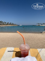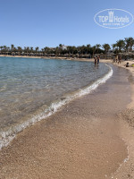 Вход в воду с центральной части комфортный. Песок и немного гальки. Плавают медузы. Волны слабые. Вода вблизи голубая, вдали синяя, очень красиво. Вокруг лагуны есть где погулять, опять же с левой ее стороны дойдя до конца можно обнаружить 2 скамейки, вид с которых на море вдаль просто потрясный. Также оттуда можно увидеть пляж соседнего отеля. На пляже работники могут перенести лежаки куда нужно, работают аниматоры. В наш приезд людей было немного, места всем на пляже хватало.