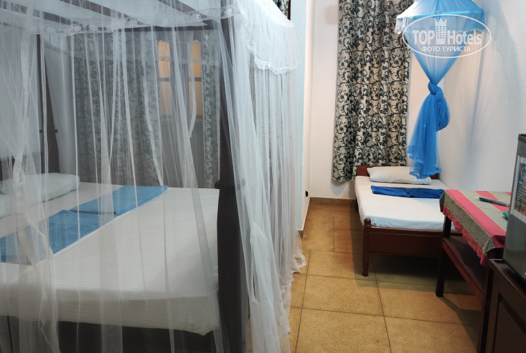 Все примерно совпало. Начну с того что наш рейс задержали на 8 часов, должны были мы прилететь днем, а прилетели поздно ночью. Из аэропорта мы брали индивидуальный трансфер, такси, так как был длительный перелет и хотелось быстрее уже добраться до номера. Приехав ночью, искали вход вместе с таксистом))) Темно ничего не видно, подпись гест хауса есть, а входа нет. Таксист позвонил со своего номера владельцу отеля и тот объяснил, что надо зайти в зеленые ворота, ворота без подписи кстати. Всё оказалось очень просто, мы после перелета уже не сообразили. На территории нас встретил владелец с удивленным лицом, Анжу. Тут же вышел его помощник, взял сумки, они друг другу что то сказали и показали чтобы шли за ним. У нас был оплачен делюкс, поэтому нам дали комнату с подписью делюкс)) В данном гесте все комнаты подписаны стандарт и делюск, отличаются они расположением, видами и размерами. Есть два здания, одно центральное большое и маленькое сбоку двухэтажное, центральное здание как лабиринт, там есть номер с видом вообще во внутреннею часть гест хаус. Ресепшен кстати тоже имеется в гестхаусе, но там никого нет. Хозяева все на первом этаже живут. Мы жили в маленьком двухэтажном. К слову у делюксов лучше вид, расположение комнаты и чуть больше чем стандарт, но совсем чуть чуть больше. ХОТЯ в этом гест хаусе все комнаты очень разные! Есть большие делюксы, есть маленькие, есть с общим или индивидуальным балконом. У нас был наверное средний, комнатка не большая, чистенькая, балкон индивидуальный. Одна кровать большая и маленькая для ребенка. Обе с москитными сетками. Был кондиционер, ТВ, холодильник, чайник, две тумбы, шкаф…и что то подобие сейфа, просто железный ящик на ключе Сначала было тревожно в него складывать ценные бумаги. Но другого варианта не было. Успокаивали себя, что на всей территории камеры, это прямо плюс. У нас ничего не пропало, все в целостности и сохранности оставалось. Туалет и душ стандарт, в туалете было мини окно, наверное для проветривания)) Все работало исправно, как по мне правильно установлен кондиционер, над кроватью т.е дует поверх кровати, получается, что охлаждает, но не продувает. У нас был индивидуальный балкон, это прямо плюс, для нас это важно. Мы обедали на балконе и вечерами там сидели, и вообще часто выходили подышать теплым воздухом)) Единственное что на балконе не работала лампочка, и с ней в принципе какие то проблемы были, мы не стали заморачиваться, включали фонарик на сотовом. Поэтому лайфхак возьмите с собой фонарик маленький и будет вам свет. Кстати свет отключают на Шри ланке и часто. Но в данном гесте есть генератор поэтому мы были со светом, а главное с кондиционером! Большой плюс!