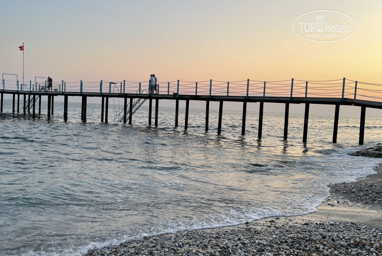 Пляж галечный, заходить босиком не всегда комфортно. Немного дальше от пляжа есть пирс. Есть бочча,волейбол, футбол, степе аэробика,водное поло. Детский клуб тоже регулярно развлекает детей .Детская дискотека тоже есть, куда без нее.