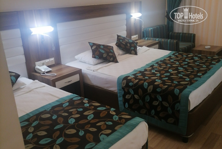 Номер обычный: двуспальная кровать, кровать и раскладывающийся диван - всем места хватило) тв, холодильник, большой шкаф.