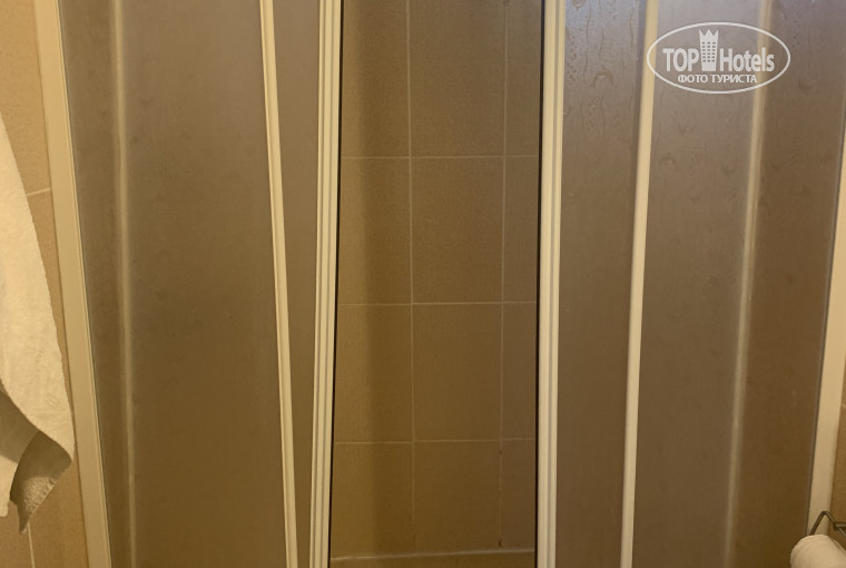 Протиснуться на балкон, когда все в номере, нереально. Вернулись все в синяках на бедрах. Холодильник стоял “для мебели” - для него просто не было розетки. Розетка между кроватями оказалась нерабочей имитацией. Единственная рабочая занята телевизором. Вообще все держится на одном винте и честном слове… Унитаз течет, душевая не закрывается, вся вода льется на пол и круглые сутки стоят лужи возле стен. На двери ванной и в душе на стенах плесень. На полу старый ковролин в пятнах. Частенько сильный запах канализации, особенно по утрам. Фен из 80-х, огромная коробка на стене, пользоваться невозможно - нагревается и обжигает руки. Номер явно двухместный, куда впихнули третью кровать. При заселении было две бутылки воды 0,5 на троих, два душ-геля и два шампуня, по два комплекта полотенец. полотенца дополнительные дали и регулярно меняли, но больше ничего не пополнялось, даже туалетную бумагу пришлось просить. Постельное белье за две недели сменили один раз. На ресепшен большинство персонала не говорит по-английски, а исключительно по-турецки.