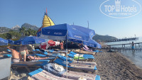 Ну и главное- МОРЕ и пляж! МОРЕ чудесное, чистое, вода прозрачная (были на разных пляжах Бильдиби- почти везде вода у берега с природным мусором). Здесь такого не было. Заходить в воду лучше в аквашузах из-за камней. Спуск пологий, места всем хватает, никто под ногами не путается. Береговая линия пляжа небольшая, пляжное место отеля вытянуто вглубь. Поначалу зонтиков и матрасов на лежаках было мало, поэтому люди приходили в 5-6 утра занять места, позже натянули тенты и привезли матрасы, проблема исчезла (наверное опять спасибо Курбан-байраму и нахлынувшим отдыхающим))). В отеле можно брать полотенца для пляжа (без депозита).