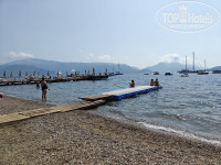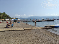 Расположение отеля считаю удачным. Находится на краю Мармариса, ближе к Ичемлеру, можно гулять в обе стороны. Если взять велосипед то можно отправиться на пляжи в сторону Ичемлера, они чище и малолюднее. У самого отеля пляжа нет, ближайший муницыпальный находится метрах в 300 от входа в отель. Представляет собой кусок береговой линии с мелкой галькой и натыкаными зонтиками без лежаков. Бесплатный и грязноватый. Лучше поискать пляж мечты в сторону центра или Ичемлера, благо тут много пляжей с синим флагом.