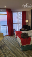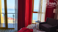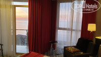 Номер в первый день дали неплохой (якобы других номеров уже не было), но на следующий день нам неожиданно "подфартило")) - днем на полу в ванной появилась какая-то непонятная лужа. Оказалось , что течет со стены вентшахты, в которой, как оказалось, проходят стояки с водой. Устранить течь было можно только взломав стену - поэтому нам предложили переехать в другой номер. Сначала предложили номер через пару комнат от нашего по коридору, но он было явно меньшей площади, хотя и с отличным видом на море. Мы попросили предложить именно улучшенный номер, а не стандарт. Может есть и такой. А вдруг). В итоге оказалось, что соседний номер стоит пустой и он по факту он оказался гораздо лучше нашего. Вроде и рядом, вроде и похож, а оказывается и площадь номера чуть больше и вид из номера на море лучше и внутри номер чище, светлее. Так что после этой замены мы решили что 2 января, как планировали, мы теперь точно уже не поедем. Останемся здесь еще на 3 дня)