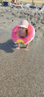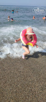На пляже мелкая галька вперемешку с крупным песком (вообще идеально очень приятно ногам, детки зависают роят ямки, возводят горки, ищут ракушки и круглые стеклышки), дальше к морю фракция камней становится крупнее, а в метрах 6-7 от берега начинаются крупные камни и плиты, так что на волнах будьте осторожны. Волны достаточно сильные, ребенка совсем без присмотра лучше не оставлять. С утра море бодрит а вечерком уже парное молочко. Заход в море есть с берега и с пирса. Заход с берега довольно крутой, тут нет такого что ты зашел в воду и еще метров 10-15 идешь по мельководью. Дно не однородно и в 20 метрах от берега есть места где можно стоять на дне по грудь.