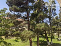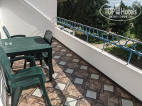 Видела по крайней мере три типа номеров. В номерах со 2 по 4 этаж лоджии открытые, на лоджии стол, стулья, сушилка для белья. С моего второго этажа был виден кусочек моря в промежутке между деревьями. В маленькой спальне двухспальная кровать, 2 тумбочки, открытая вешалка с плечиками, кондиционер. В гостиной холодильник, телевизор и либо 2 кресла, как было у меня (одно- — двухместное размещение), либо раскладной диван (трех- — четырехместное размещение). На 1-м этаже лоджии застекленные, и гостиная устроена на лоджии, здесь кроме стола и стульев, холодильник, телевизор, кондиционер. Обе комнаты меблированы как спальни: в одной комнате двухспальная кровать, в другой две односпальные (четырехместное размещение). Санузлы к этому сезону успели отремонтировать только в одном стояке, т. е. по два номера на всех этажах в части здания ближе к рецепшн. Как это выглядит, я не видела, в моем номере ремонта еще не было, и вода из душа стекала в дырку в полу в середине санузла.
