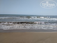 Широкий протяженный пляж, очень чистый, особенно по сравнению с прилегающими замусоренными пляжами. На пляже есть 2 навеса, лежаки без матрасиков и 6 домиков с матрасами, два летних душа, они же кабинки для переодевания, краны для мойки ног возле обеих калиток на пляж. Пляж песок и ракушечник, заход в море пологий, по песку. В море нет буйков, на пляже нет спасателей. Море было переменчивое, вода то более менее теплая, то слоями, то совсем холодная. Часто при усилении ветра поднимались волны, плавать было невозможно, но любители сабов катались на волнах.