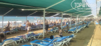 Пляж грязный. Мусор выкинуть некуда. Пепельниц нет. Поэтому и мусор на песке, который не убирают. Стаканы, тарелки убирают. Лежаки плотно друг к другу под старым навесом, поэтому позагорать не получится, если не выйти вне навеса. Зона напитков на самом пляже (вода, соки) есть под лестницей. Каждый день в море волны (спокойно покупаться в прозрачной воде не получится), но и в этом тоже есть свои плюсы. Лучше сразу для купания уходить влево ( там и чище и народу меньше и качели есть и пирс с крабами).