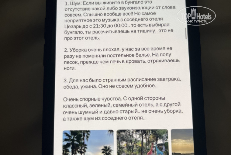 1. Шум. Если вы живите в бунгало это отсутствие какой либо звукоизоляции от слова совсем. Номер достаточно уставший, но самое ужасное, это двери. Они старые, деревянные и шум от закрытия… Слышно вообще все!! Но самое неприятное это музыка (дискотека) из соседнего отеля Цезарь с 21:30 до 00:00.. то есть выбирая бунгало, ты рассчитываешь на тишину и покой..но к сожалению это не про этот отель…