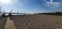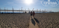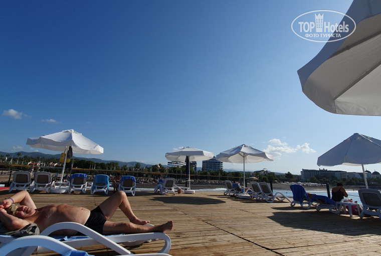 На пляже очень удобные лежаки хорошего качества,натянутые тенты,пирс большой с лежаками и зонтами огромный плюс отелю.В проходах деревянные дорожки,пляж песочный.Вход в воду мелкая-средняя галька,огромных камней нигде не встречал.Купался в спецобуви,и без неё с пирса.Минус-очень плохо убирают пляж вокруг лежаков,я понимаю что многие туристы(свиньи)и им тяжело выбросить окурок или мусор в глиняный горшок,которые стоят через каждые 4 лежака,но это не значит,что пляж не нужно чистить.Ну а Средиземное море как всегда-красота,каждый день разного цвета и чистейшая.Один день была гроза,но после 17.00 вышло солнце и успели ещё искупаться.Аквапарк и для детей и для взрослых отличный,один раз скатился по самой длинной горке,мне хватило адреналина,возраст уже не тот))Бассейны чистят,обрабатываемые средства как и во всех отелях запах приемлемый,а вот в воде в кранах запах хлорки был ужасный,аж зубы противно чистить было.Ещё ни в одном отеле такого количества не встречал,я понимаю что перестраховываются от всякой заразы,но не до такой же степени)).Про туалеты уже писали,заметил только постоянную воду на полу возле главного ресторана,скорее всего из-за того,что туда ходят купающиеся в главном бассейне.В остальных такого не замечал,в которых был)).Анимация нормальная,конкурсы были,каждый вечер в амфитеатре награждали и детей и взрослых,шоу-программы были через день с приглашёнными артистами,в остальные дни местная самодеятельность,но тоже смешно.Интернет беда бедовая,то ловит,то нет.Стабильно только в холле возле лобби-бара.Возможности купить платный-нет.