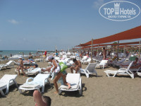 Лежаков на пляже и у бассейнов хватает всем желающим! Но народ всё-равно ухитряется занять несколько и по пол-дня на них не появляться :))) Заметно в дни больших заездов. Сам пляж песчаный с маленькой (около метра) полоской гальки уже в море. Для детей рай (если не штормит. А за 2 недели более-менее штиль был раза 4, в остальное время - волны разной силы).