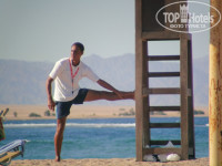 На пляж возят на автобусе (максимум влезает 36 человек), но ходит он не всегда удобно, так что кому не трудно оторвать зад можно пройти пешком за 7-10 минут. На пляже практически всегда хватает лежаков, напитки разливает человек с ящиком-холодильником (пиво намного вкуснее чем в баре, т.к. из бутылок). Вход в море по песочку, спецобувь впринципе не нужна, а справа риф и много рыбок. Уметь плавать не обязательно рыбки плавуют и там где по-пояс. Глубина нарастает плавно метров через 5-10 от берега уже нужно плавать, начинается глубина, но без обрывов, всё предсказуемо. Так что пляж два в одном, такое редко встретишь.
