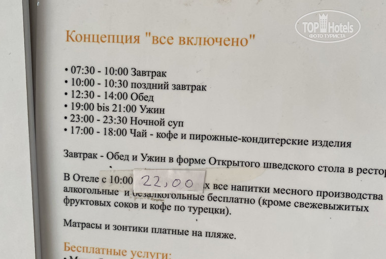 Прибыли в 10:30, заселили мгновенно. Наш состав: Я, моя мама пенсионерка, моя пятнадцатилетняя дочь и мой сын один год четыре месяца. Номер дали с тремя кроватями одна из которых была двух спальная. Номер оооочень уставший, мебель вся очень старая покрашена в какой-то неприятный синий цвет Но: хорошие плотные матрасы, стираное чистое белье без дыр и пятен. И в туалете тоже все очень печально, старая сантехника, естественно уже где-то что-то не отмывается, Но: вода горячая с хорошим напором круглые сутки, нигде ничто не протекало, унитаз работал, гели шампуни мыло положили. ЭТОГО всего уже было достаточно для ночлега за 1000₽ в сутки с человека, так как мы в этом путешествии хотели получить море и солнце. В эту стоимость входило питание все включено, мы особо не на что и не надеялись, Но: голодными мы не были, да и аналогичное наблюдала и за гостями отеля. Да не было мяса, крабов, фруктов. Но каждый может найти себе что-то чтобы перекусить. На завтраки были яйца в крутую, омлет яичницу жарили у бассейна, какая-то молочная каша или суп, жареные грибы или баклажаны в виде рагу, овощи салаты зелень оливки сыр видов пять два вида соевый колбасы. Сухие завтраки в разных вариантах, Джем и мёд , шоколадная паста кунжутная паста. Мандарины. Отдельно хочу отметить кофе машину, вполне достойно! На обед из гарниров макароны картошка рис различные гуляш и овощи в виде рагу. Салаты свежие овощи зелень. Яблоки. Десерты отвратительные)) на полдник с5 до 6 вечера чай кофе печенье и манник