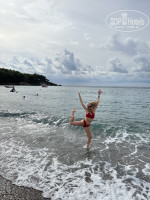 Много лежаков, теплое море, что для меня было неожиданно очень ☺️, пляж мелкогалечный, волн почти нет- для детей самое то) рядом бары, детские водные горки- я тоже каталась и осталась без спины от стыков, не супер они мягкие😂вода в бассейнах холодная, в море теплее в разы)