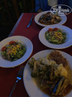 Еда на любой вкус:мясо,рыба,салаты,различные гарниры,овощи на гриле, выпечка и т.д.Ну и конечно же самые вкусные десерты.