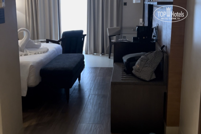 В самом номере катастрофически не хватало шкафа и полок для вещей. Комната просторная, но вещи приходилось свешивать через стул. У нас был номер с прямым видом на море и это было чудесно. Курить нельзя ни на балконе, ни в номере, ни на пляже. Есть специально выделенные места для курения, только там можно. При заселении попросили внесли залог 300 евро. После выезда нам вернули наши же купюры.