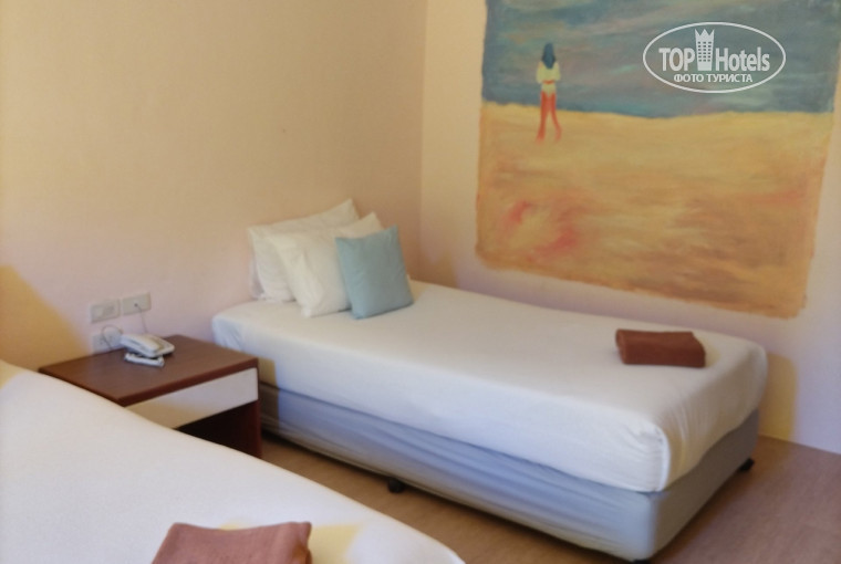 Сам отель, точнее номера без вида на море, до пляжа пять минут. Свой пляж, шезлонги, зонтики бесплатно. Море теплое, прозрачное, заход светлый песок. Народ есть, но не так как на пляже у пристани. В самом отеле ресторан, завтрак хороший, на выбор. Мы брали комплект омлет, сосиски, бекон. Дали тост, джем, масло и корзиночку с минипирожными. Вкусно, голодными не остались.