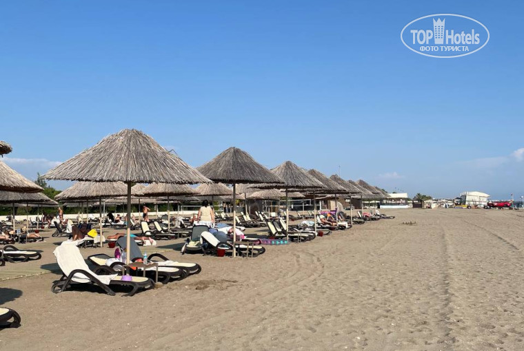 Чистый песчаный пляж, широкая береговая линия, пологий заход. На пляже есть бар, где подают нарезанные фрукты и можно взять напитки)