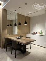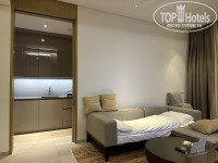 У нас на троих был самый маленький номер 75 м.) Номера новые, стильные. В каждом номере отдельная спальня и гостиная со столовой зоной, мини кухня с раковиной, комби микроволновкой и большим полноценным холодильником. Кофемашина, капучинизатор и чайник. Немного посуды (тарелки, салатники, чашки), приборы. Мини бар. В ванной все необходимое, халаты, тапочки, банные принадлежности. В номерах прекрасная шумоизоляция, что порадовало.) Почти все номера имеют вид на бассейн или море, номеров с видом на помойки и стоянки нет.)