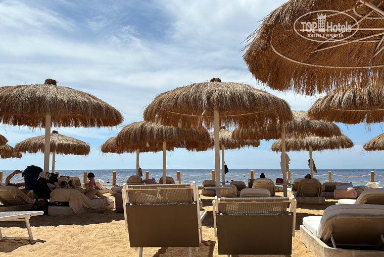 Пляж. Просторная территория с невидимым разделением между двумя отелями, вы можете лежать с детьми из другого отеля пососедству, а можете уйти на 16+ территорию. Бар работает с 10, а чуть позже начинают ходить бармены и предлагать напитки.