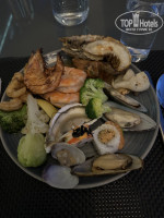 По питанию у нас был полупансион (завтрак+обед или завтрак+ужин). Мы всегда придерживались схемы завтрак+ужин. Завтрак каждый день однообразный: много фруктов, мюслей, хлопьев и тд., сосиски куриные и из говядины, повар при тебе может приготовить омлет с разными добавками или скрэмбл, панкейки и вафли с разными джемами, шоколадным или ванильным кремом/пастой, чай/кофе/соки включены в завтрак, можно самому заказать горячие напитки на барной стойке или попросить официанта. Также из еды: 2 вида красной рыбы (слабокопченая и просто соленая), оба очень вкусные, овощи. Также были национальные блюда, но их, в силу вкусовых предпочтений, не пробовали. Можно завтракать как внутри ресторана, так и снаружи. Предпочитали снаружи, так как внутри достаточно сильно работает кондиционер и шумно, плюс хотелось подышать свежим воздухом. Мест снарeжи хватает, но при высокой загрузке отеля на завтраках можно несколько минут подождать в очереди, но могут предложить столик в соседнем ресторане итальянской кухни, куда можно приходить с едой со шведского стола.