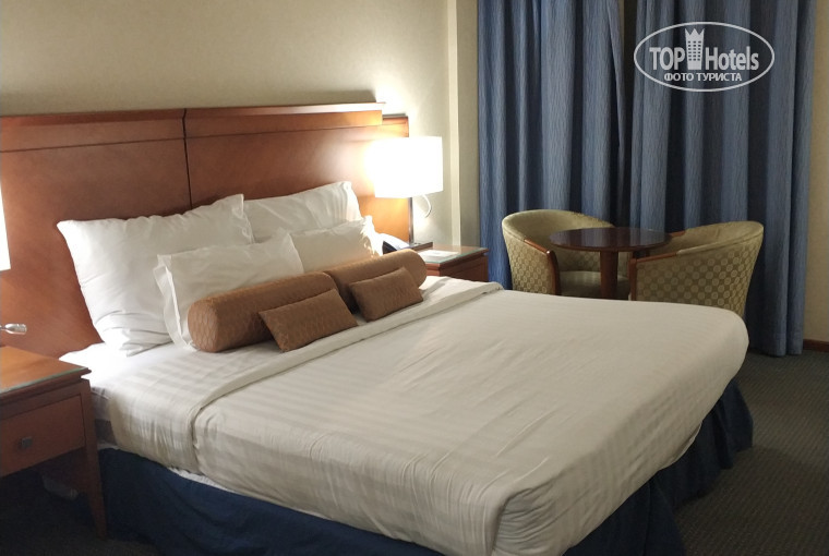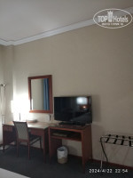 В номере есть телевизор (русскоязычные каналы - TV RUS и Freedom), кондиционер, встроенный шкаф, двуспальная кровать, письменный стол, холодильник, две тумбы, стул, журнальный стол, два кресла, сейф (бесплатно), чайник, чашки, стаканы.