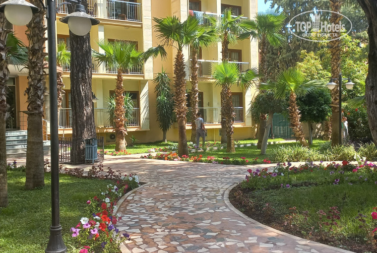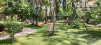Территория: она совсем небольшая, всего 3,3 га. но очень зеленая и грамотно спланирована. Ощущение, что находишься в лесу с вековыми хвойными деревьями в сочетании с пальмами вдоль дорожек. Есть зона для отдыха с качелями, скамеечками и гамаками.