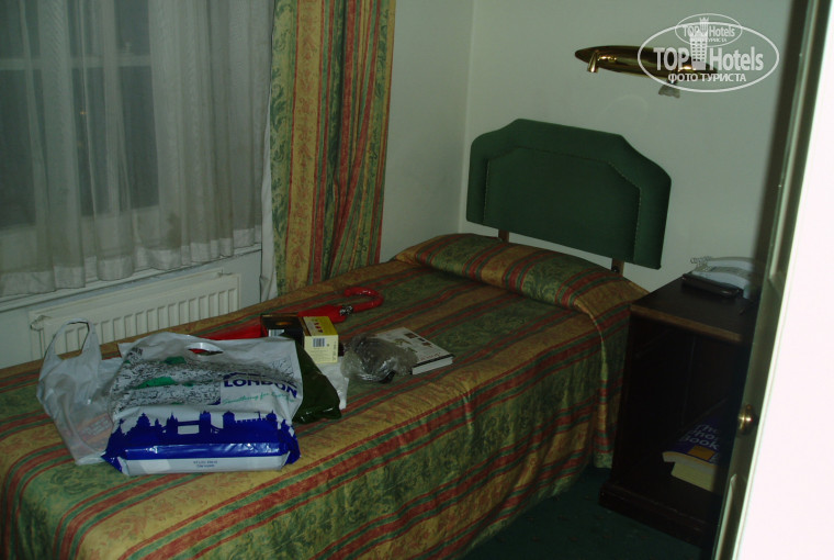 в номере одноместном: кровать, тумбочка, шкаф, туалет и душ (очень маленькое помещение), зеркало, телевизор, телефон, принадлежности для приготовления чая (чашка, ложка,чай, кофе,сухие сливки и сахар). Окна английские, поэтому приходиться выбирать или в номере жарко или прохладно. вид из моего номера был во двор, плюс не сразу дом напротив, а небольшое "парк" На завтрак - сок, чай, кофе, два больших тоста, джемы и масло. Персонал на ресепшен англоговорящий. Сейф платный на рессепшен (10 фунтов), переходник под залог на ресепшен (5-10 фунтов). Если вечером нечего делать - рядом есть боулинг центр и небольшой каток (мне понравилось).