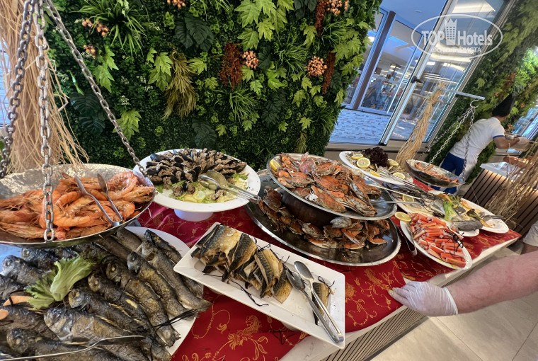 Питание : очень хорошее , морепродукты , мясо , рыба , курица , много фруктов , из ягод клубника и черешня , овощи всегда свежие