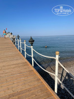 Перейдем к пляжу. Понятное дело, что он объединён для двух отелей, измерили шагомером-примерно 350 метров. Поэтому проблем с лежаками нет. Кроме того, если видят нехватку мест, то оперативно добавляют лежаки и зонты. Вход в море-боль для ног. Но на территории Санрайза есть отличный пирс, из новеньких гладеньких досок, и очень порадовали лестницы в море (без ржавой коросты, как часто бывает). Поэтому спуск в море и выход по пирсу, и никаких проблем. Для тех, кто умеет плавать, разумеется.