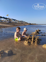 Огромный лежаков раза в 2 больше отдыхающих , для семьй с маленькими детьми очень удобный вход с берега, но нужно быть внимательными, попадаются камни и заплывают скаты.