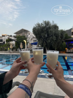 Территория отеля также небольшая, но её достаточно. В зоне столовой есть места как внутри, так и снаружи. Есть возможность поесть с видом на море. В зоне бассейна с лежаками есть бар, можно спрятаться от солнца и выпить что-нибудь холодненькое.