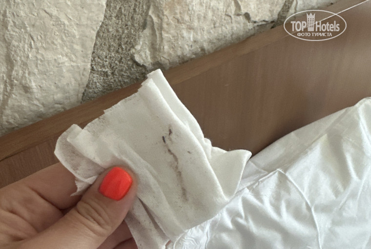 Далее, надеясь на смену отеля (пусть даже с доплатой), мы пошли пообедать. Обед нас также расстроил — была сухая рыба не первой свежести и безвкусные пластмассовые овощи (фото прилагается). Так и оставшись голодными, так как есть это было невозможно, мы пошли на ресепшн, благо нам дали номер чуть раньше времени заезда. Придя в номер, мы еще раз убедились в том, что нужно покинуть данный отель. Номер нам сдали как «после уборки» — весь в песке, пыли, грязи, с порванной простыней, грязными санузлами и неработающими лампочкой и телефоном (фото прилагается). Нам пришлось снова вызывать уборщицу, технику и менеджера отеля Нину, чтобы это все засвидетельствовать.