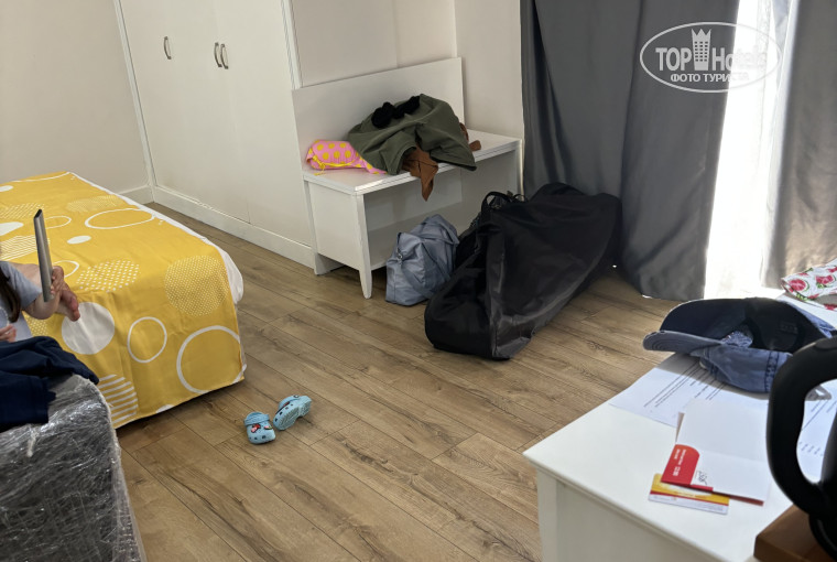 В итоге нас заселяют на самый верхний этаж в главном корпусе, на мансарду. Очень маленький тесный душный номер, потолок возле выхода на балкон такой низкий, что бились головой. Шкаф совсем низкий, развешать даже взрослые футболки нереально, они не вмещаются. Я уже молчу про платья.