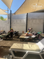 Территории нет. Есть два бассейна - один совсем маленький, второй побольше под бетонной стеной. Выглядит удручающе. Еды много, с мясом всё плохо. В основном салаты, макароны и т.д. Яичницу на завтрак жарили всего пару раз и то без ничего, просто глазунья. Столы не сервируют, приборы надо брать самостоятельно. Из напитков в баре только пиво, вино (пить невозможно), порошковые соки и лимонады разливные (кола, спрайт и т.д). Никаких коктейлей или крепкого алкоголя. Пляж. Это очень странное место, представляющее собой проход между двумя бетонными стенами, забитый лежаками под какими-то драными полотнами (типа навес). Выглядит это как стихийное бедствие. Возле воды тоже есть немного лежаков, но занимать их надо в 6 утра. Зонтиков нет никаких. Заход в море ужасный - огромные валуны. Идти до пляжа минут 7 - по улице, потом в обход мечети.
