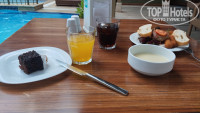 Часто бывает такое, что ты набрал в тарелку еды, положил на свой стол и идёшь за второй тарелкой или напитком, а сотрудники (официанты) забирают тарелку со стола с едой и утаскивают. Приходишь — стол пустой. Неприятно. Но бывает и другая крайность — официантов мало, иногда они не успевают убрать после других. Такое ощущение, что столы не протираются. Сами столы старые, в трещинах и потёртостях. Очень часто не хватает бокалов в столовой. Нет питьевой воды в бутылках, которую свободно можно брать, например, из столовой, на прогулку, в номер или на пляж. В прошлом отеле, где я был, стояли три холодильника с питьевыми бутылками на 0,5 литров. Удобно. Здесь этого не хватало. Соки не очень вкусные, явно искусственные. У двух аппаратов, которые выдают сок, нужно тянуть рычаг на себя, чтобы пошла подача. И сок при этом заливает рычаг, который до меня могли трогать десятки людей — это не гигиенично. У третьего аппарата всё нормально. Кофемашина часто была пустой, наливала просто воду.