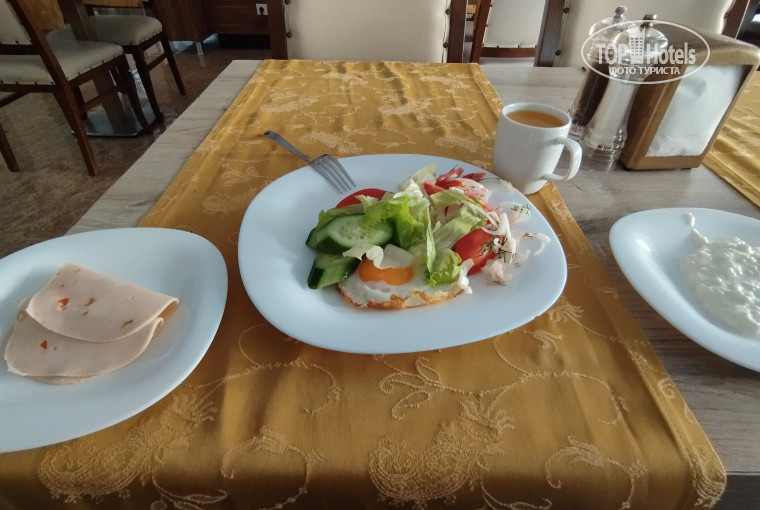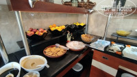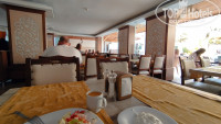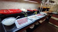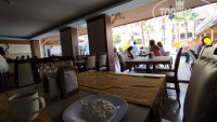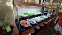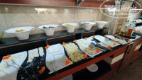 Сама столовая больше напоминает какое-то неизысканное кафе. Не очень большое по размерам, первый попавшийся стакан оказался грязным (остатки заварки, то ли плохо моют, то ли какая-то ещё причина, после такого стал внимательно проверять все приборы и стаканы, но случай был единичный), большие вентиляторы вместо нормальных кондиционеров, сильно дуют, может заболеть. Еда не особо разнообразная, мясо мало (а шашлыка, к примеру, ни разу не было), фрукты страшно брать: непонятно мыли они их или нет, судя по грязной кружке. Надеюсь, что мыли, выбирать-то не из чего. Помидоры, огурцы, яблоки, апельсин, изредка слива. Есть арбузы, выпечка. Иногда в столовой нет свободных столиков, и ты вынужден искать свободный столик, оглядываясь, не уходит ли кто, или подсаживаться к кому-то. Летают мухи, которые садятся на еду, после них есть противно. Липучки для борьбы с мухами помогли бы (их можно поставить не на виду, чтобы вид не портить). Нет средства для дезинфекции рук в столовой. Так же обычно в отелях есть четыре-шесть умывальника, где можно руки с мылом помыть. Здесь такого нет. Надо или идти в туалет возле ресепшена, там руки мыть. Естественно, так никто не делает, а если бы делали, то очередь туда была бы на двадцать минут, ведь там умывальника всего два, да и дверь ты открываешь немытыми руками, оставляя грязь на ручке двери, а потом открываешь дверь чистыми руками, опять пачкая их об уже грязную ручку, которую трогали до тебя десятки людей (а ведь после туалете не все руки моют, трогая ручки двери теми же руками, что держали свои пенисы при мочеиспускании). Не гигиенично. В итоге люди вынуждены кушать немытыми руками. Я таскал с собой влажные салфетки, протирал ими руки.