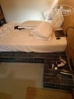 Эта конструкция из стекла и металлических реек в метре от спального места, Один человек идёт ночью в туалет - второй просыпается за компанию!!!!((((, кровати нет, вместо кровати матрас на цементном подиуме с кафельной настенной плиткой скользкой сам подиум прямоугольный с углами, малейшее неосторожное движение и возможно травмироваться, тумбочек тоже нет.