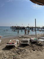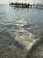 Рядом катера, на воде с утра бензиновая пленка бывает, пока мало народа. Пляж очень маленький, куча народа потом. Лежаки под навесом норм. В два ряда лежаки возле воды, стоят очень плотно, впритык друг к другу, получается ты сидишь с чужим человеком рука об руку. Столики почти отсутствуют.