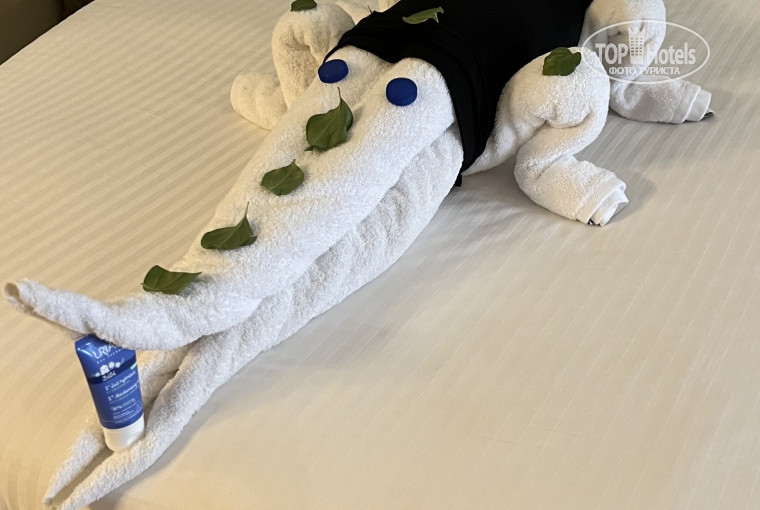 Из минусов , как и писали нехватка лежаков. Реально чтобы занять место необходимо вставать в шесть утра и топать на море. Несколько раз спали дольше потом просто стелили полотенце на песочек. Вечером долго и громко играет музыка. Это мешало уснуть с учетом того, что утром в шесть утра занимать лежак. Берите беруши если прям совсем любите тишину и спать с открытыми окнами или номер подальше. Я кстати спала всегда с открытыми окнами комары на беспокоили.