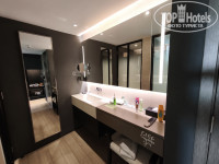 Душевая кабина и туалет имеют стеклянные стены и дверцы, с игривыми прозрачными верхом и низом. Кабина имеет две лейки: большую «дождь» и маленькую на гибком шланге. Гель, шампунь, и кондиционер «прибиты» к стене. И в душевой, и в туалете есть ниши в стенах для дополнительных аксессуаров и мелочей. Светодиодное освещение и цвета отделочных материалов дают красивую и гармоничную игру света и тени. Все сделано аккуратно. Но, если пользуешься большой лейкой в душе, то много воды «просачивается» через дверцы наружу. Если пользуешься маленькой лейкой, то тебя постоянно бодрит контрастный душ. Полотенце повесить негде, за ним надо будет тянутся к креслу, что предусмотрительно стоит напротив душевой. Вода с дверей предательски стекает в коридор, формирующая лужа в одном из номеров упрямо сбегала в сторону коридора. В туалете вроде бы есть гигиенический душ, но не было мыла. Единственная полочка под полотенца только в туалете, все полотенца на ней могли уместиться только в свёрнутом виде, если полотенце вдруг упадёт, то оно угодит прямиком в унитаз. Поэтому сушили их на вешалке для верхней одежды.