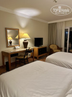 Заселение. Приехали мы поздно в десять вечера, автобус туроператора долго вёз с аэропорта. На ресепшене нас оформили быстро, одели браслеты, дали два электронных ключа от номера, памятку о правилах отеля, пароль от Wi-Fi и отправили на поздний ужин в ресторан. Номер у нас был 3105 на втором этаже, в третьем корпусе с видом в сторону моря. При выходе из номера открытый коридор с видом на весь бассейн. Номер хороший, большой с двумя удобными кроватями с резной спинкой у изголовья, большим балконом и ванной. На полу плитка. Три тумбочки, три светильника, торшер, журнальный столик, два кресла, телевизор, полка под телевизор, большой стол со светильником и зеркалом, стул, полка для вещей. При входе большой встроенный шкаф с зеркалами (для меня это важно), с сейфом, холодильником, чайником (две кружки, пакетики с чаем и кофе, сахар). В отеле общая система кондиционирования, настраивается легко, пульт управления на стене, работал прекрасно в жару +42. На балконе столик и два металлических стула. Всю обстановку я выложила в фотографиях. Вся техника работала, сейфом пользовались каждый день бесплатно.