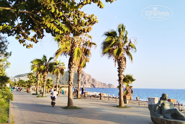 Всем здравствуйте. Пишу отзыв об отеле. Отель находится на первой береговой линии. До пляжа метром 200, через дорогу. Лежаки покупали на ресепшене, квитанцию показывали на пляже. Примелькались, и потом квитанцию никто не просил) На пляже есть бар, играет музыка. лежаки рабочие,свободные лежаки были всегда. Море теплое, местами плиты, но коралки нас выручали, при отливе волны, виден нормальный вход в воду. Пляж Клеопатры чистый. Но море волновалось дней 5( не купались. В отеле есть 3 бассейна. Детский, горки различные, дискотека, анимация вечером. Питание все включено. {удалено модератором: несанкционированная реклама} Отдыхом довольны. В номер приходили только спать. Отель находится в городе, пешком дошли до Крепости Алании, и поднялись на фуникулере. Вид потрясающий. Прыгала с парашютом, с местной горы. Непередаваемые ощущения.